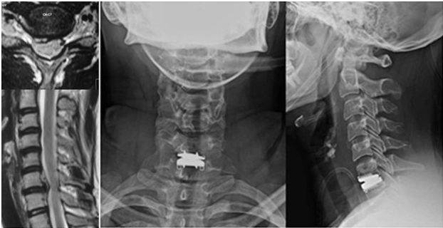 MRI shows disc prolapse at C6-7 level with proximal migration causing pressure on the right C6 and C7 nerve root. The post –operative xray shows C6 corpectomy from the front and fusion with expandable cages and plate.