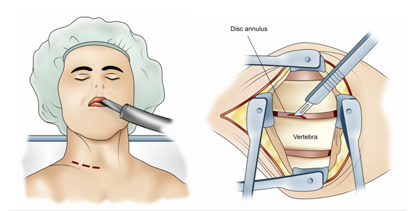 Picture showing a standard 4 cm skin crease incision along the front of neck used for a discectomy. The disc is removed relieving pressure on the nerves.