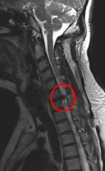 MRI shows disc prolapse at C6-7 level causing pressure on the right C7 nerve root.