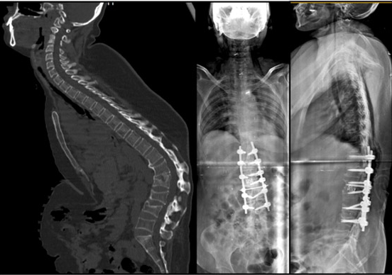 A patient with complex post-traumatic kyphosis treated by osteotomy and stabilization.