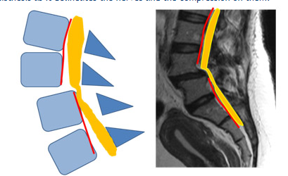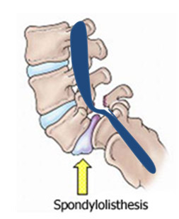 Spondylolisthesis leads to compression of nerve roots (shown in blue colour)
