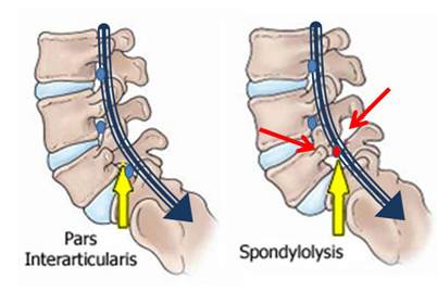 Spondylolysis is a defect or fracture of part of the vertebral bone called the pars interarticularis. It usually occurs in the fifth lumbar vertebra and, less commonly, in the fourth lumbar vertebra. Spondylolisthesis is a forward slippage of one vertebral body on top of another.