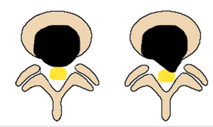 The disc when slips backwards (black colour), can press on the nerve root causing leg pain (sciatica).